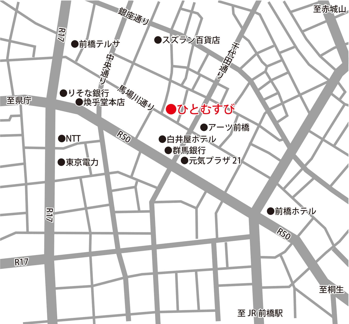 スマホナビご利用の場合はヤフー・グーグルマップで "前橋 ひとむすび" と入れて検索してください