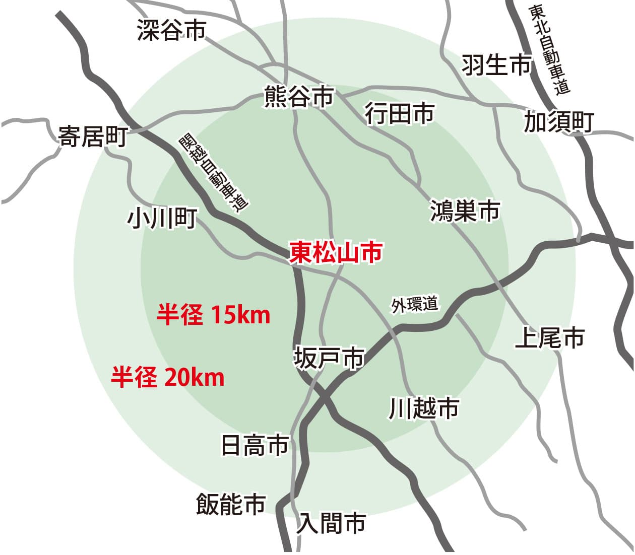 ②出張相談をお受けするのは、原則下記地図緑丸の範囲内とさせていただきます