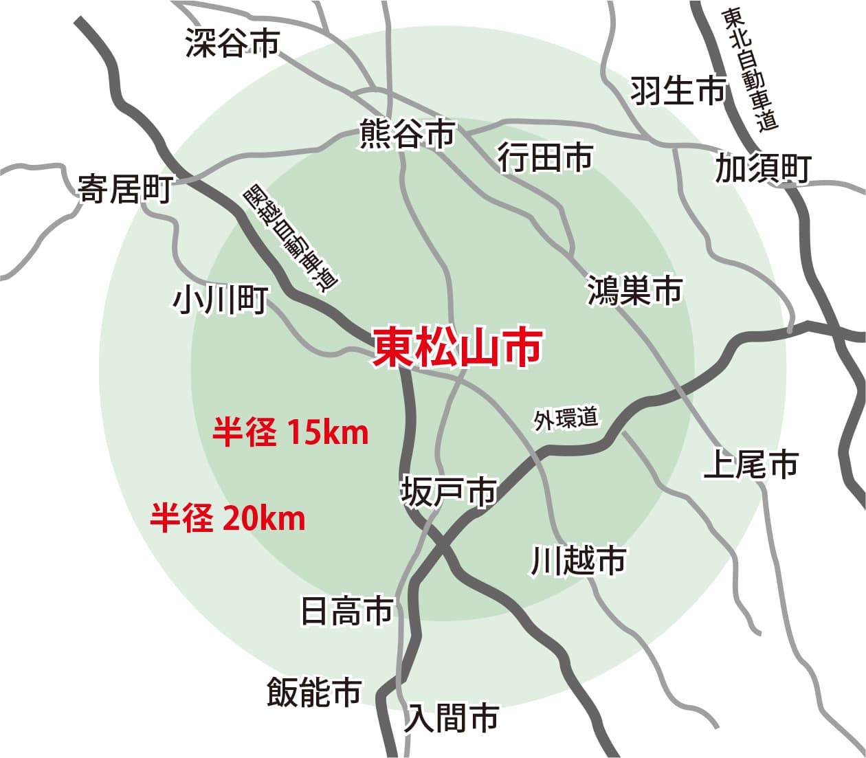 ②出張相談をお受けするのは、原則下記地図緑丸の範囲内とさせていただきます